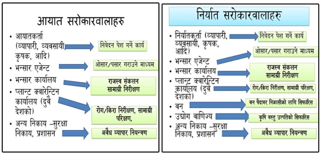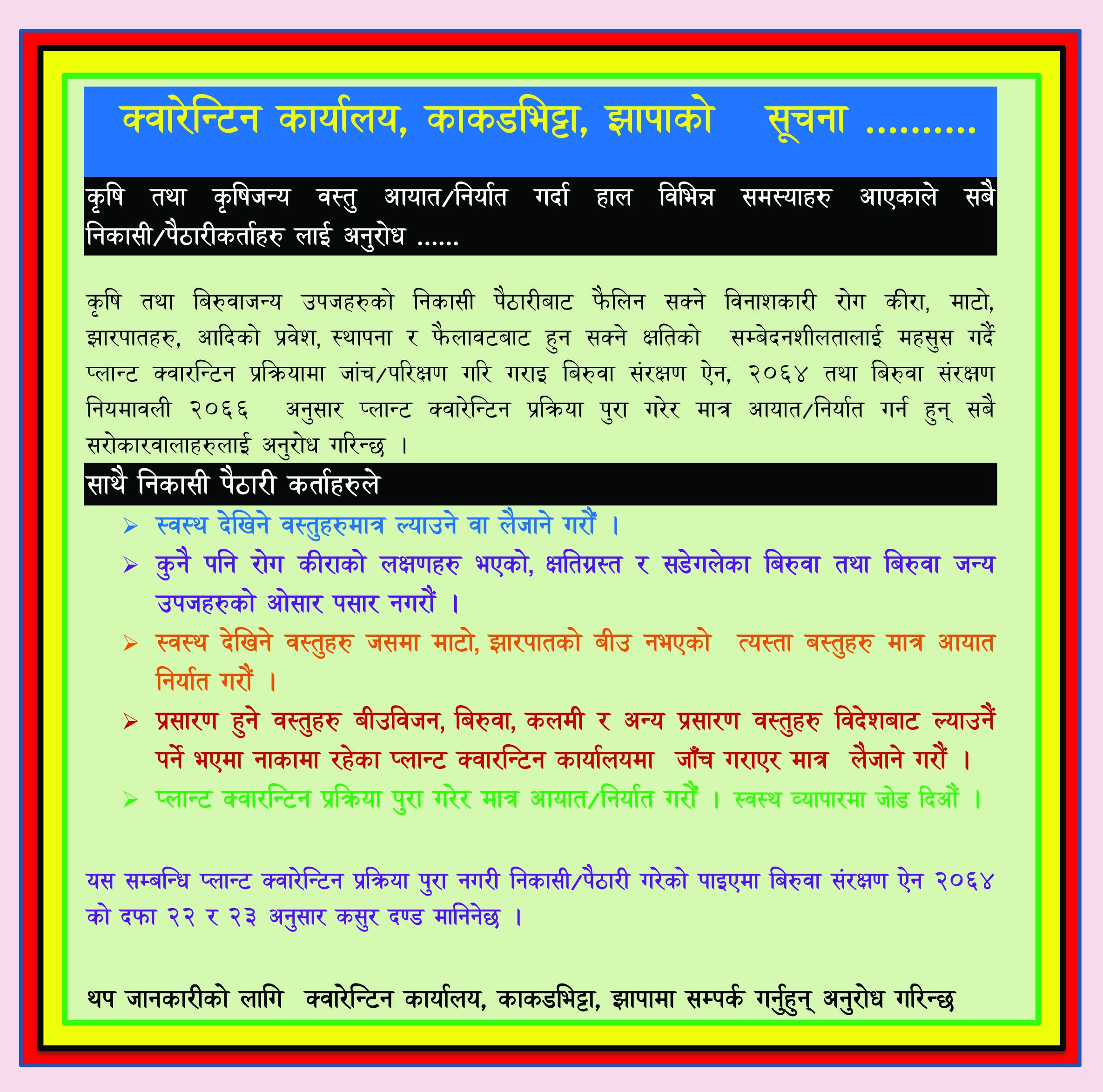 बिरुवा तथा बिरुवाजन्य उपजहरुको निकासी पैठारीबाट फैलिन सक्ने विनाशकारी रोग कीरा, माटो झारपातहरु, आदिको प्रवेश, स्थापना र फैलावटबाट हुन सक्ने क्षतिको  सम्बेदनशीलतालाई महसुस गर्दै प्लान्ट क्वारन्टिन प्रक्रियामा जांच/परिक्षण गरि गराइ बिरुवा संरक्षण ऐन, २०६४ तथा बिरुवा संरक्षण नियमावली २०६६  अनुसार प्लान्ट क्वारेन्टिन प्रक्रिया पुरा गरेर मात्र आयात/निर्यात गर्नुपर्दछ । हाम्रो कृषि उत्पादन घटिरहेको छ ,उत्पादन लागत बढिरहेको अवस्थामा जैविक विविधतालाई ठुलो चुनौती बनेको छ । जसमध्ये  केही उदाहरणहरु यस प्रकार रहेका छन् । १.आलुको ब्याक्टेरीयाबाट हुने ओइलिने खैरो पिप चक्के रोग, धानको पातको फेद कुहिने रोग,Potato tuber moth, Citrus Greening Disease, African Giant Snail,बनमारा झार आलुको ऐजेरु रोग Kernal bunt of wheat, Club Root of Crucifers  अतः यस्ता शत्रुजीवहरुबाट हुने नोक्सानीबाट बच्न सबैले प्लान्ट क्वारन्टिन प्रकृयाको महत्व बुभनै पर्छ , आवश्यकतालाई महसुस गर्ने पर्छ र ऐन नियमको अनुसरण गर्ने गराउने कार्यलाई प्रभावकारी बनाउनै पर्छ । अन्यथा यस्ता अवान्छित तत्वहरुबाट भोलिका दिनहरुमा हाम्रा बालीनालीहरुमा अझै बढी  नयां शत्रुहरुको आक्रमणमा वृद्धी हुने छ, वन जंगलको जैविक विविधता खतम हुदैं जाने छ । यस्ता शत्रुजीवहरु एक पटक  स्थापित भैसके पछी तीव्र गतिमा प्रसार हुन्छन् र नियन्त्रण कार्य असाध्यै कम हुन जान्छन् जसको प्रत्यक्ष असर हामी र हाम्रा सन्ततिहरुलाई नै पर्न जान्छ । आयात/निर्यात तथ्यांक अद्यावधिक, निकासी/पैठारीमा अवलम्ब गरिएका प्रयासहरुलाई दिगोपना तथा प्रतिस्पर्धाका रुपले  कार्यालयको वेबसाइट डिजाइन आ.व. २०७८/७९ तयार गरिएको छ ।
